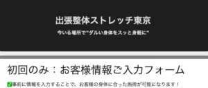 初回のみ、お客様情報ご入力フォームのご回答をお願いしておりますが、特典として、施術時間に加え+15分、出張費無料でお伺いしております!